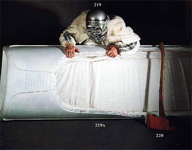 A full head mask of reinforced aluminium and g.r.p. with neckguard, hinged tinted goggles, noseguard and grilled mouth and chin area with three vents on one side, the back of the head applied with three red paper stars and inscribed in black felt pen Cruncher and inscribed on the inside G.S.; and a padded ski-jacket of white nylon, the zipped hood lined with white imitation fur, applied under the arms with reinforced plastic, both arms with two reflective grey stripes, the right arm applied with a circular white patch embroidered with a design incorporating a silver W - both made for the 1993 Twentieth Century Fox film Alien 3"