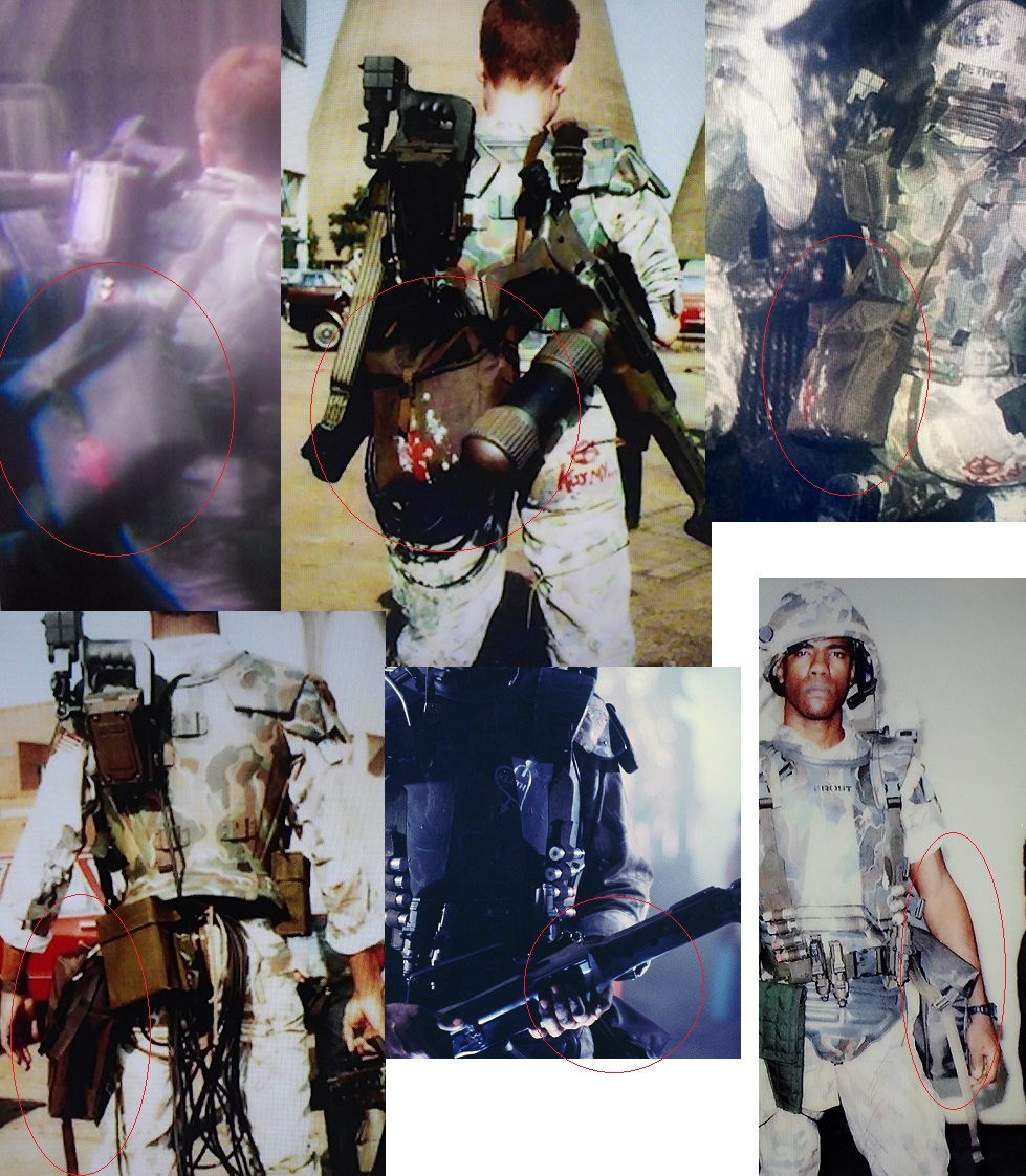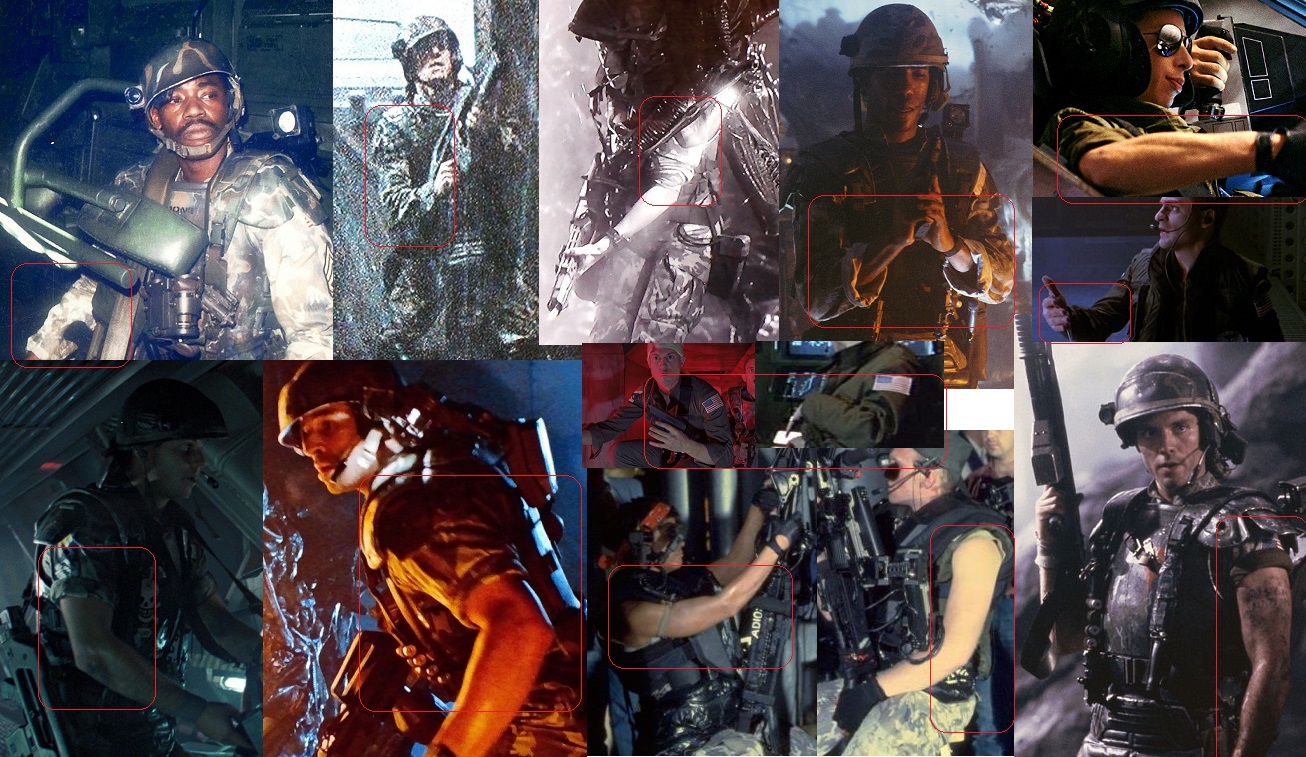 -PouchesWith the exception of the smart gunners, who do not wear them at all, The "standard" layout for pouches is one "small pouch" on the right hip, and one "large pouch" on the left buttocks. The variations occur when there is more gear added, like Hudson's hack pouch and Dietrich's medic bag which leads to them being scooted to other spots of the belt. Hicks is the only exception. He only has the one large pouch (2nd pic of Hicks is actually Remar as Hicks, but Hicks' single pouch is visible several time in film).