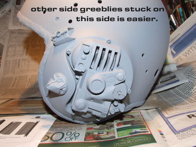 I photocopied the greeblie templates and cut them out, by moving them around, and mostly judging by eye, I managed to trace a rough outline of the shape onto the helmet with first pencil then made clearer with a black marker pen.