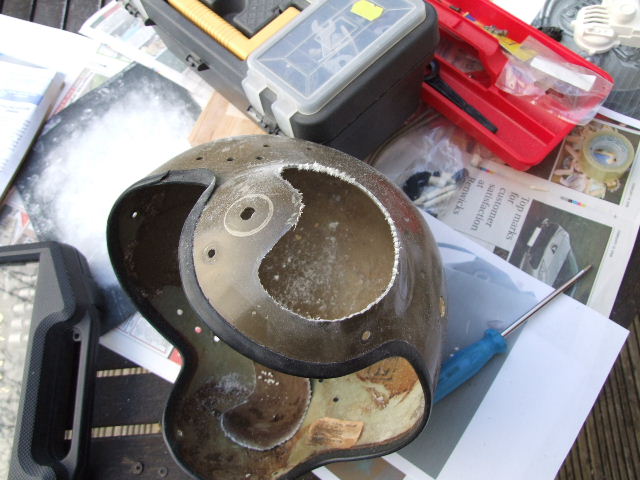 I glued the metal plate into position with a generous amount of epoxy resin. Once the glue was set I used body filler to fill all the gaps. Building up the curved wall on the kidney shaped side was the biggest pain. It is all then sanded back using the screen used helmet photos as guidance.