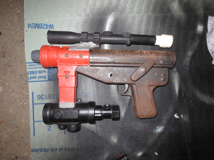 The top scope is off a toy Han Solo blaster with some PVC pipe extension. The bottom is a scope is from an Airsoft gun I picked up at Goodwill a while back. For some reason this picture makes everything look crooked. It's not in real life. The back section of the Rexim slides open, so I'm going to detail the interior as well. It did mean that my top scope had to attach further up than the one in Alien, but the trade-off is worth it to me. Also I might be able to build up the front of the area that slides to recreate the look of the closed gun without sacrificing the movement.