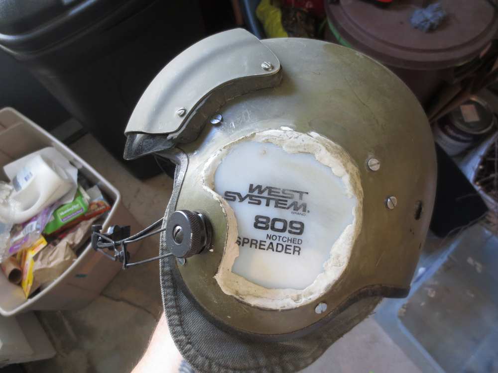 One ear cup cut out (following the template from Stephen), one to go. For some reason I imagined the helmet would be more difficult to cut into, but really it is quite easy to work with. Nice!