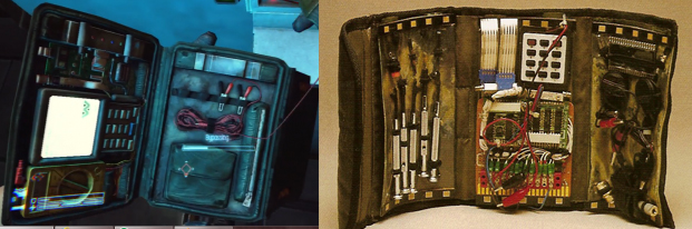 I took a bunch of in progress screens that I posted here somewhere, of it closed and as it opens and I looked around on eBay for alligator clip test leads. The smallest I could find were 1.5" long, and judging by the size of the player characters hand, it looks about accurate. So with that, I took a screen of it open with the 4 clips still inside the pouch into Photoshop, and I measured one clip and called its bounding box 1.5", I then multiplied it by copy and pasting it several times and stretched it top to bottom and left to right which gave me an approximate dimension of the pouch closed, which was roughly 8" x 5". I confirmed this by the glitch I got in my video where the bypass kit actually disappears for a second, revealing the cradling hand, I took a piece of paper and folded it in half and layed it across my hand, as seen in the screen and it's pretty close, mind you, my hand is a little smaller so the paper seemed a bit larger.