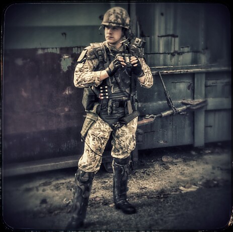 Looking good! A question on the added camo; looking at that picture I can see the difference between the collar and the bit of collarbone area not covered by the armor. Have you thought about making a dickie that would cover that part and go under the armor completely? Probably not worth the effort; from a distance I doubt I could tell the difference.