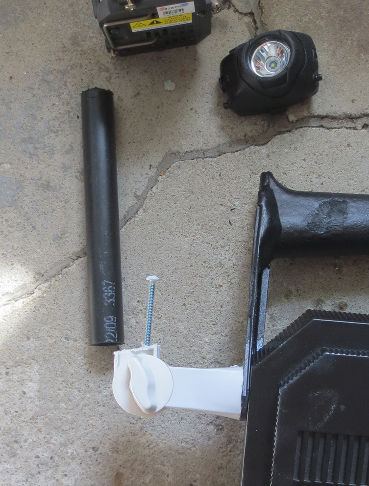 The base is part of a McFarlane Toys display stand. I gutted it to make it less heavy. The handle is cobbled together from part of a packing tape dispenser and the sides off the top of a VHS tape rewinder with a lot of two part epoxy and a few coats of black rubber spraypaint. The arm is PVC pipe, the joint from a clip fan, and a piece of a toy gun.