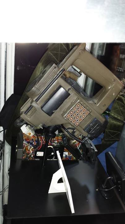 [scene missing] Sorry, I got a fire under my tail and put everything together without taking any more photos, although there really wasn't much more done aside from painting. The only significant thing I did that I failed to take a picture of is instead of drilling a 1/4" hole in the side for the slide viewer to plug in to, I installed a 1/4" female jack part into the side of the Kango body. This allows the viewer to pivot without coming out. I used a 1/4-1/8 jack adapter (a < $5 item). The installation involved drilling a hole that the jack would fit into, and gluing it into place. All that is left is to install two swivel mounts for the strap, and to touch up some paint. The build didn't take much time, and everything fit together with minimal effort. It's also notable that the slide viewer halves snap together securely, allowing one to change the picture behind the view screen, or access added electronics. The screen is from a google picture result, and the keypad is a file that was posted here on the board. For reference, the print size on them was 64mmx50mm and 45mmx34mm respectively. The large black wire is from a guitar patch cord, and the headphone jack & wire is from a pair of headphones.