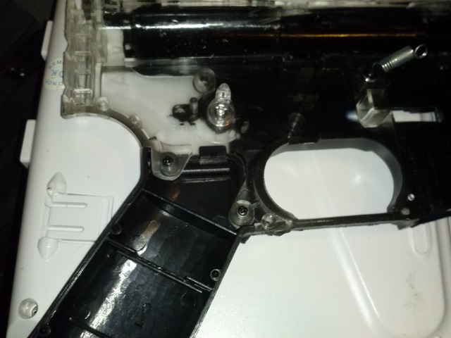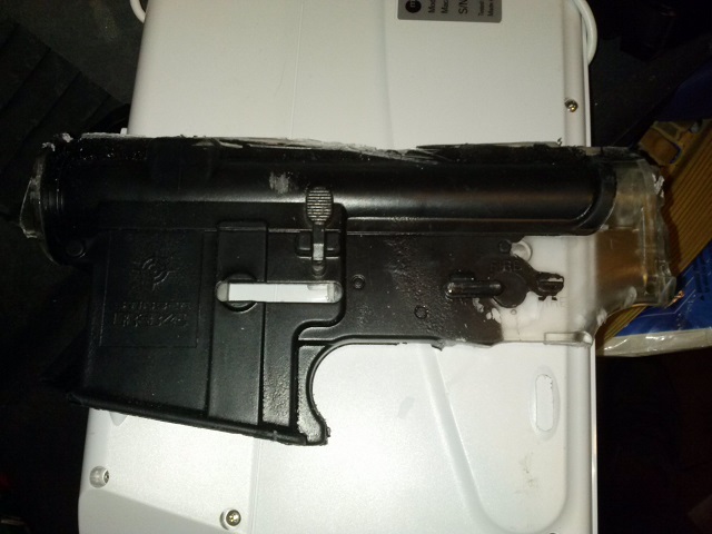 But that section is really going to be for the other side of the back end, and that means the forward assist (as well as the trigger etc.) need to be removed. I hacked as much of it off as I could, but it's going to take some fine work with a file and sandpaper to completely remove it, then I'll have to reconstruct the area I've cut away to smooth it out.