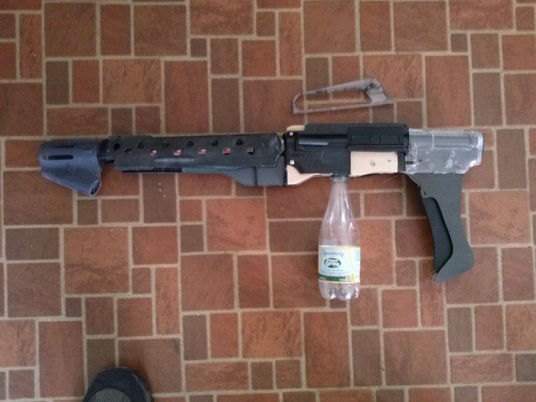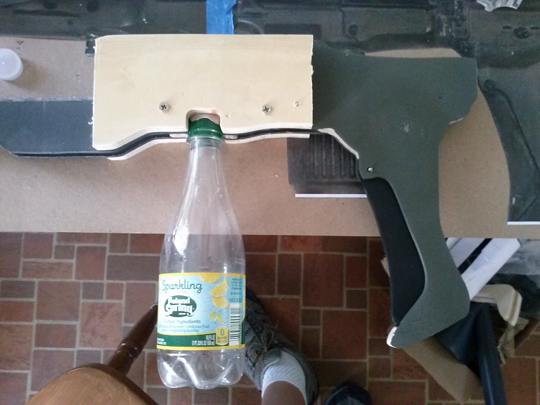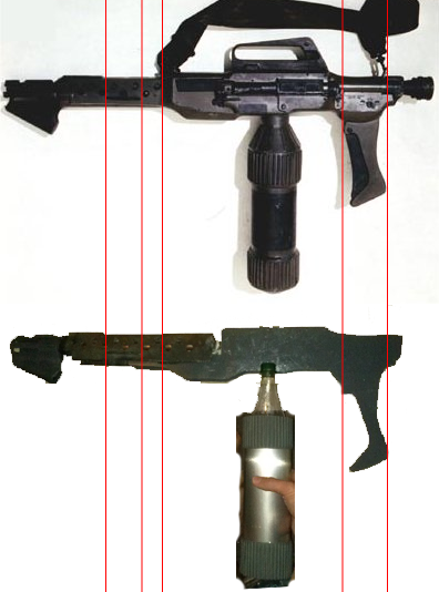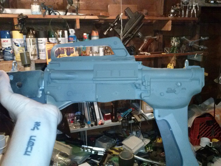 So then as the putty was quickly setting up nice and hard I realized the angle I'd drilled into the resin piece was wrong and making the whole tip droop. No one likes a droopy tip, so I pulled it apart as much as I could and bent the rod right where it met the resin (it had already bonded inside the piece too much to free it without risking breaking it). Luckily, this seems to have fixed the problem. The rod doesn't go through the center of the plexi body in a straight line (it angles up toward the back of where the carry handle will go), but who cares? Once it is screwed and puttied in place it won't matter. The plexi also continues up under the back of the M203, so that will be a second area of support for the front, and then finally the back (including the last few holes) of the M203 is encased in putty, creating a third support. Here's a test fit with "fuel tank 2.0" held up for comparison.