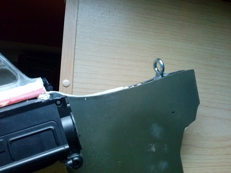 Sorry for the fuzzy pictures, I was rushing to get this part done (which of course came back to bite me). So first I drilled out a hole in the resin front piece for a threaded rod to fit through. If you look carefully you'll no doubt notice that the horizontal vents in the front are not level with the length of the rod. Oh if only I had noticed this early on...