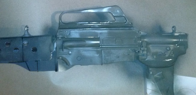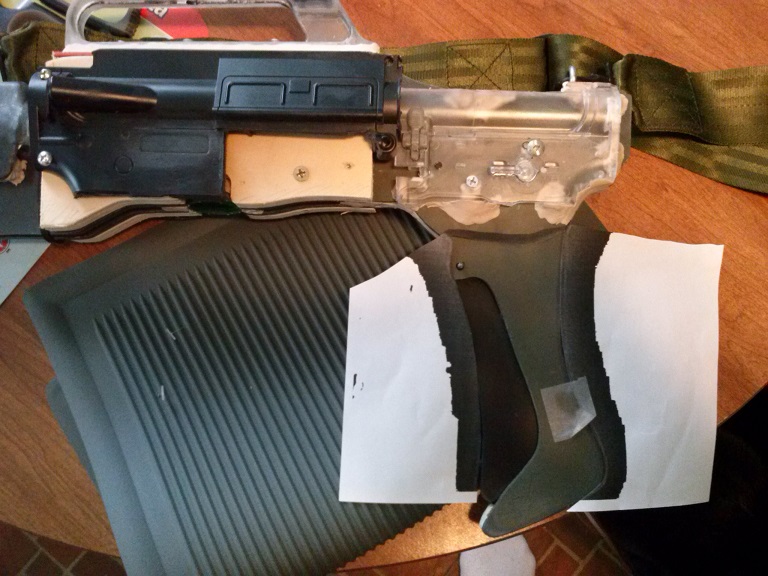 So then as the putty was quickly setting up nice and hard I realized the angle I'd drilled into the resin piece was wrong and making the whole tip droop. No one likes a droopy tip, so I pulled it apart as much as I could and bent the rod right where it met the resin (it had already bonded inside the piece too much to free it without risking breaking it). Luckily, this seems to have fixed the problem. The rod doesn't go through the center of the plexi body in a straight line (it angles up toward the back of where the carry handle will go), but who cares? Once it is screwed and puttied in place it won't matter. The plexi also continues up under the back of the M203, so that will be a second area of support for the front, and then finally the back (including the last few holes) of the M203 is encased in putty, creating a third support. Here's a test fit with "fuel tank 2.0" held up for comparison.