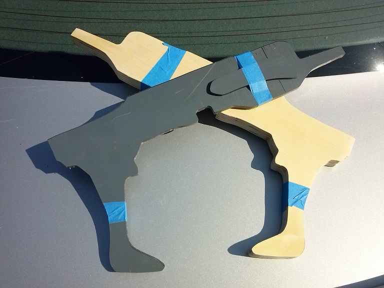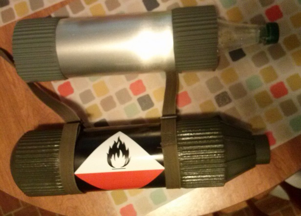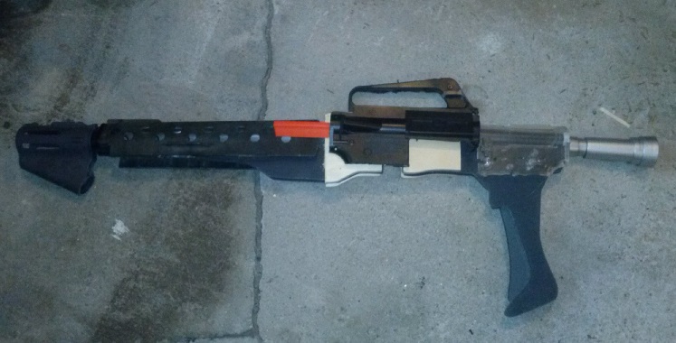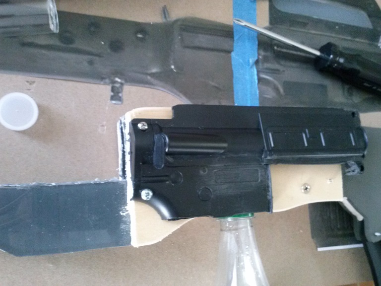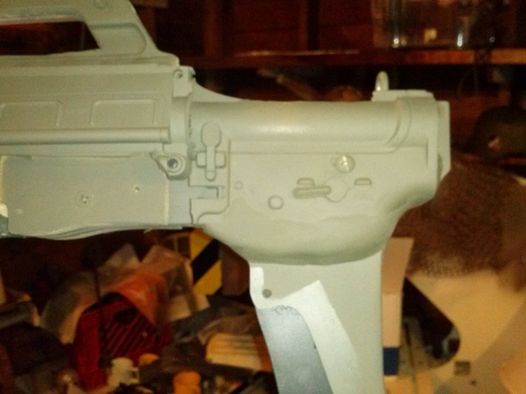So then as the putty was quickly setting up nice and hard I realized the angle I'd drilled into the resin piece was wrong and making the whole tip droop. No one likes a droopy tip, so I pulled it apart as much as I could and bent the rod right where it met the resin (it had already bonded inside the piece too much to free it without risking breaking it). Luckily, this seems to have fixed the problem. The rod doesn't go through the center of the plexi body in a straight line (it angles up toward the back of where the carry handle will go), but who cares? Once it is screwed and puttied in place it won't matter. The plexi also continues up under the back of the M203, so that will be a second area of support for the front, and then finally the back (including the last few holes) of the M203 is encased in putty, creating a third support. Here's a test fit with "fuel tank 2.0" held up for comparison.