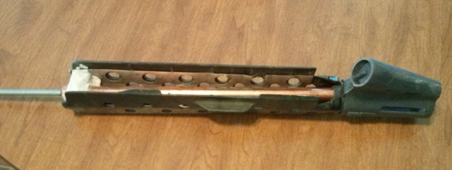 And a closeup of how the pipe looks inside the M203 (this was a lazy shot and doesn't reflect the exact placement of the pieces). My plan is to leave the bottom open until the front section is done and painted. That way I can sneak a shield inside the M203 to protect the copper pipe during painting. I'll then pull it out and finish off the bottom with some plastic sheet.
