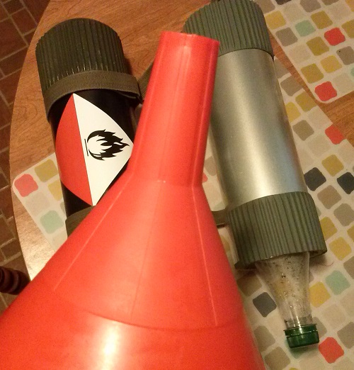 So then as the putty was quickly setting up nice and hard I realized the angle I'd drilled into the resin piece was wrong and making the whole tip droop. No one likes a droopy tip, so I pulled it apart as much as I could and bent the rod right where it met the resin (it had already bonded inside the piece too much to free it without risking breaking it). Luckily, this seems to have fixed the problem. The rod doesn't go through the center of the plexi body in a straight line (it angles up toward the back of where the carry handle will go), but who cares? Once it is screwed and puttied in place it won't matter. The plexi also continues up under the back of the M203, so that will be a second area of support for the front, and then finally the back (including the last few holes) of the M203 is encased in putty, creating a third support. Here's a test fit with "fuel tank 2.0" held up for comparison.
