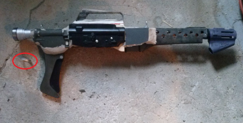Now that the back end is coming together nicely, I wanted to start fixing the area on the middle M16 that I'd hacked away. I still need to trim it up a little and drill a hole for the oval button thingy, but then I can fill in behind it and putty this up to blend into the handle.