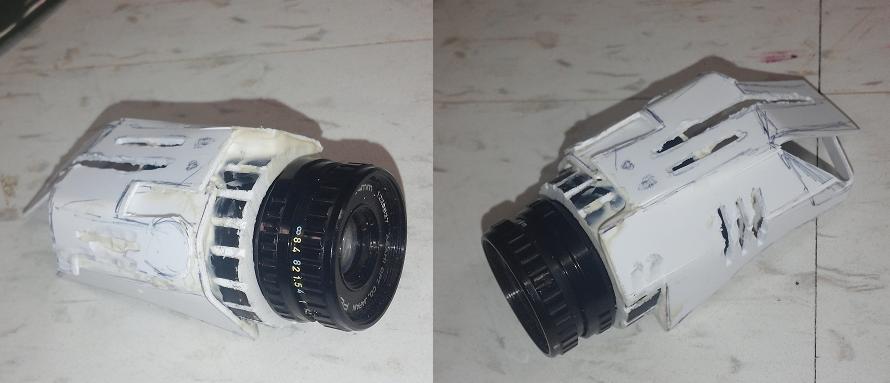 Key bits here are a 2x $6 kids 'army helmet' items from any Halloween section, a set of old 'on-ear' earphones, a pen, and other crap I find laying around that I can cut up and apply with liquid nails, and of course the smaller 24mm Pentax lens.