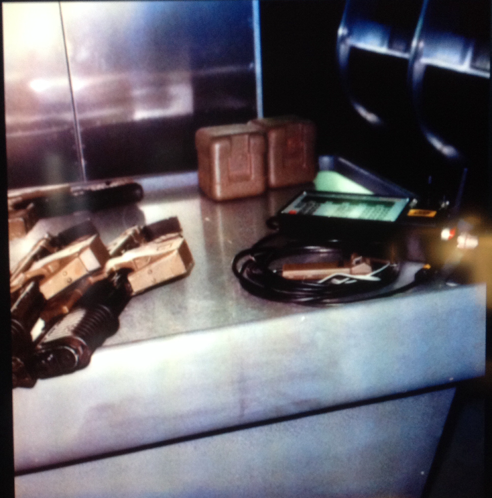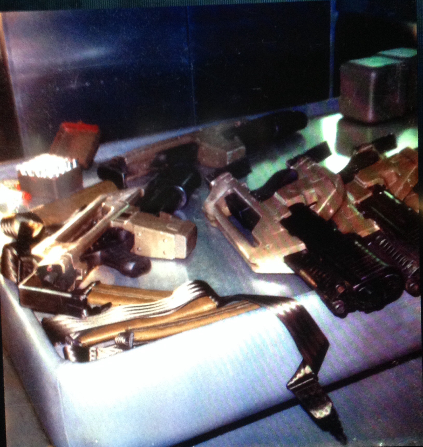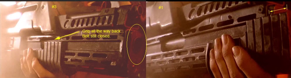 I am still a bit obsessed with this topic and have been doing some digging. Last weekend I went through the entire movie and tried to get a screen shot of every pulse rifle to appear on screen where an identifying detail might be visible. My method is very inexact (taking pictures of the screen with my phone) so please forgive the crudeness and lack of photo quality.