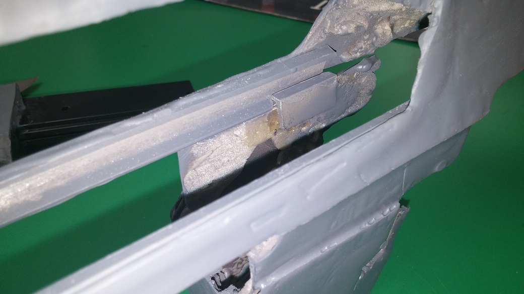 Once I abandoned hope of any functionality to the piece, I went ahead and ran two long bolts through the body of the shotgun, sandwiched the SPAS halves around it and bolted it to the for forend of the thompson. Then I promptly dropped it and it broke at the bolt points! Such cheap plastic...sigh...