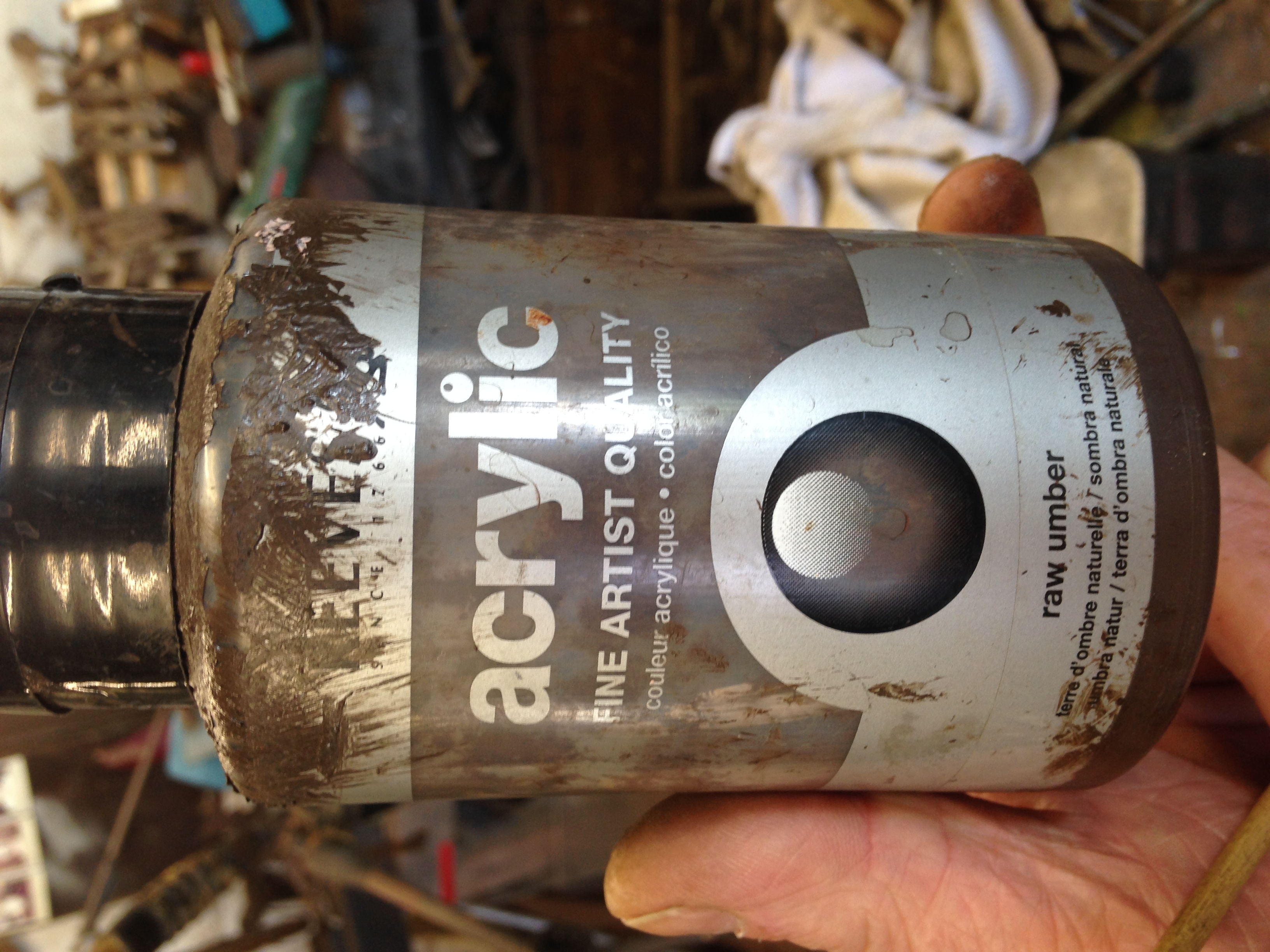 Now he showed me that to darken down the armour he wipes on then wipes off Reeves raw umber acrylic paint and that brings a closer match to the original colours, we even put a little on his chart and compared it to one of the original throat guards he made for the film and it comes up very very close!