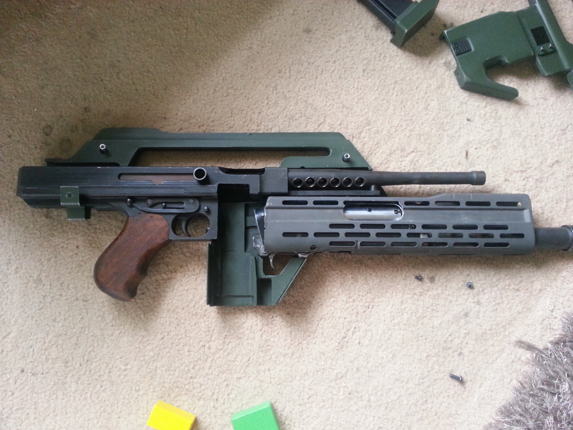 so far (as you can see) I've removed all of the unused hardware from the Thompson, cut the spas cage to suit the deactivated shotgun and done a test fit.