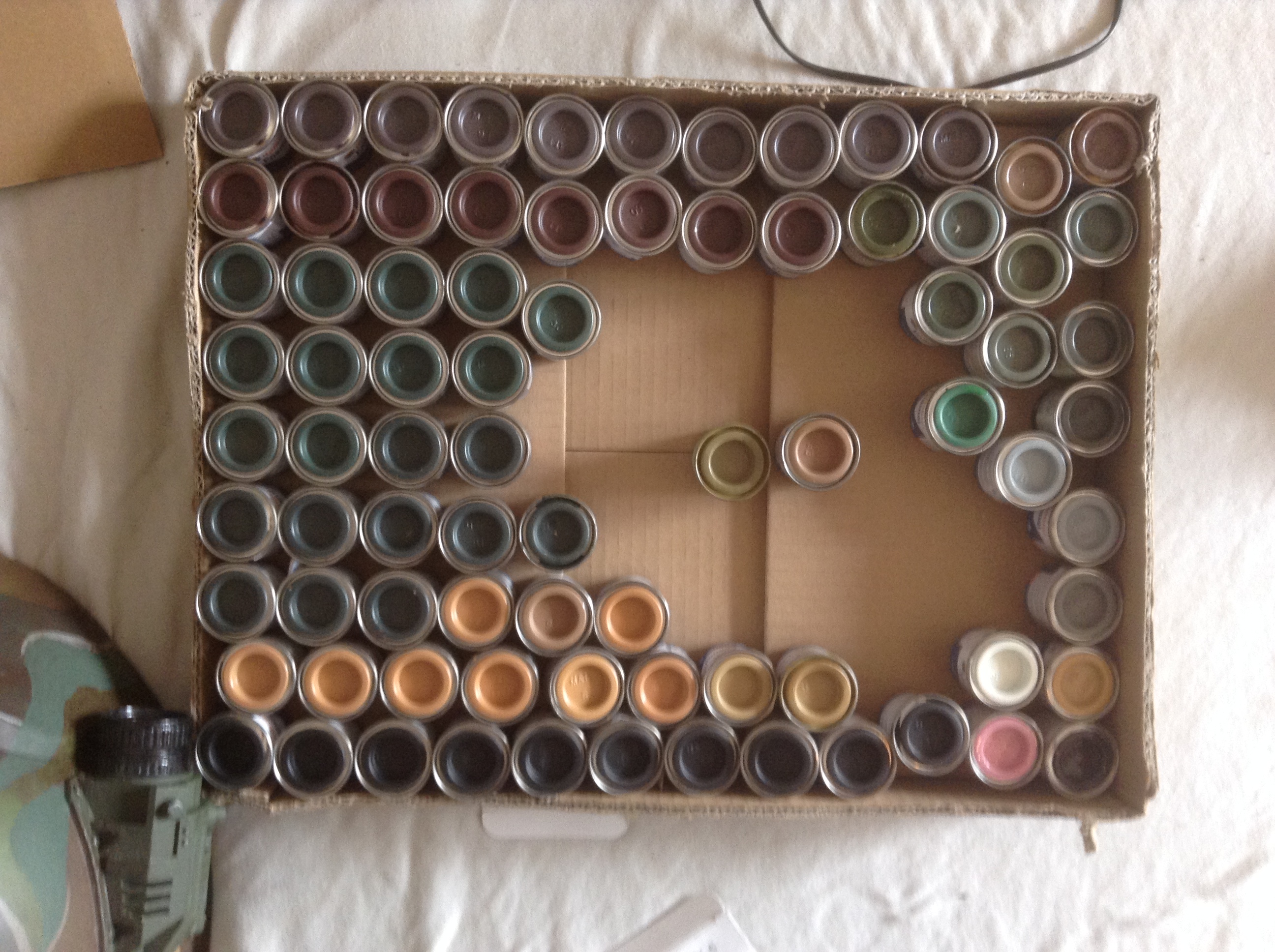 The colors I used on my armor are Humbrol 30 (Dark Green Matt), 110 (Natural Wood Matt), 88 (Chocolate Matt), 91 (Black Green Matt), 147 (Light Grey Matt).