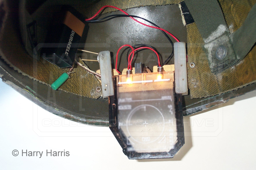 As Terry said via Matt the horizontal rubber band provides enough tension on the fulcrum to hold the lens in place in the retracted position as it's held at an angle. When the wearer pushes the green lever up it straightens the fulcrum, allowing the lens to drop down aided by the vertical rubber band. The circuit is then made by the large brass strip being 'live' (i.e. connected to the positive terminal of the 9v battery, via the bulbs) coming in to contact with a piece of metal on the lens which is (also via the bulbs of course) connected to the negative terminal of the battery. When activated the circuit is made and the bulbs come on. Simple!