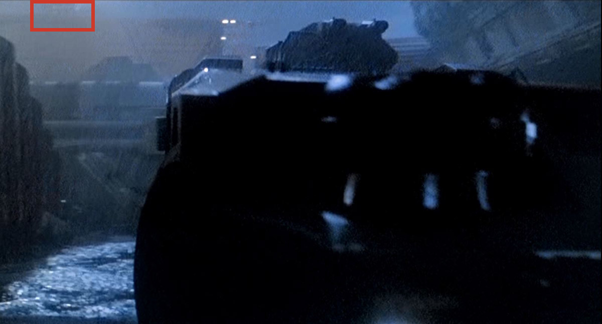 I was doing some research on the Colony and when I was doing a frame by frame viewing of one scene (where the APC rolls past the Casino around the corner to park outside South Lock) there appears to be a giant 'man' peeping over the top of the Casino building.