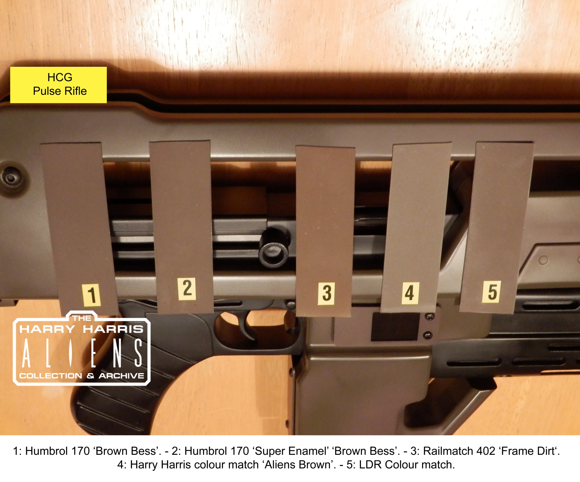So I managed to get together a whole bunch of paint this week and make up some sample swatches. I photographed them together and next to two items from my collection that are from 'Aliens', and painted in 'Brown Bess'. Now of course every camera is different in terms of how it shows colours, as is every computer monitor or other display so the important thing indicated here is how these different paints look in comparison to one another, and to something from the film. To the naked eye the samples look VERY different to how they look in the photos.