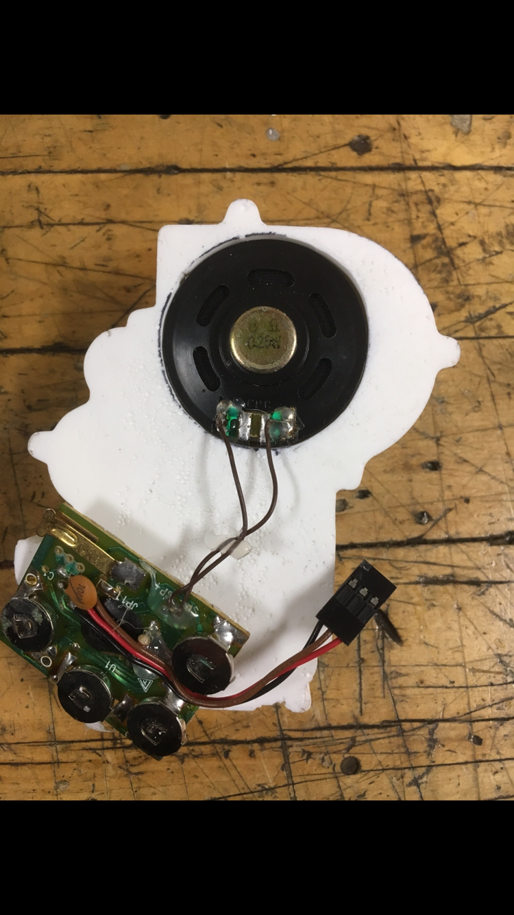 While waiting for fiberglass to cure, I hollowed out a spot for a small speaker in one of the ear gribblies. In one of the photos I’ve been using as reference, I thought I saw this done. Right now I don’t have any plans to make the speaker work but I thought it was a nice added detail. The speaker came from one of those greeting cards that play music. I salvaged the electronics long before I knew what I would use it for! lol