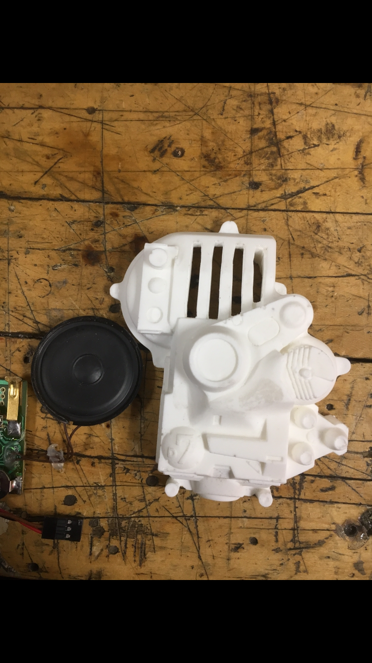 While waiting for fiberglass to cure, I hollowed out a spot for a small speaker in one of the ear gribblies. In one of the photos I’ve been using as reference, I thought I saw this done. Right now I don’t have any plans to make the speaker work but I thought it was a nice added detail. The speaker came from one of those greeting cards that play music. I salvaged the electronics long before I knew what I would use it for! lol