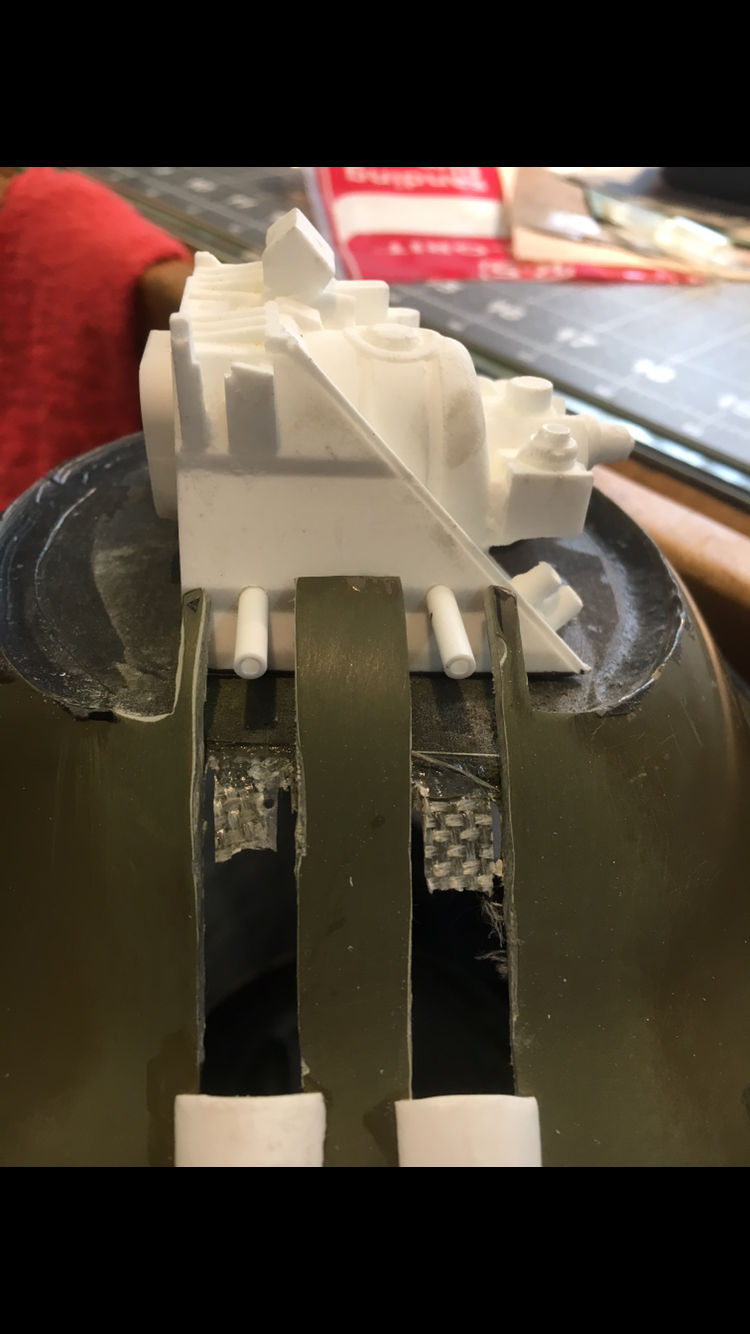 While waiting for fiberglass to cure, I hollowed out a spot for a small speaker in one of the ear gribblies. In one of the photos I’ve been using as reference, I thought I saw this done. Right now I don’t have any plans to make the speaker work but I thought it was a nice added detail. The speaker came from one of those greeting cards that play music. I salvaged the electronics long before I knew what I would use it for! lol