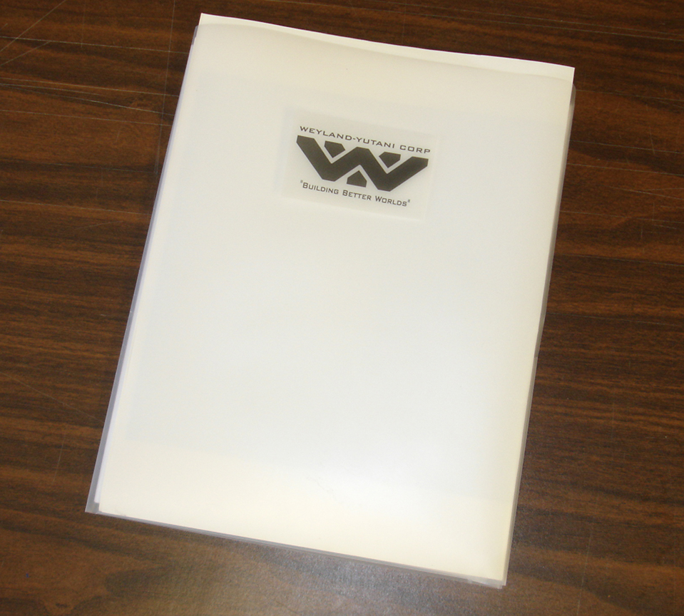 Cover of the folder, pretty simple. The folder itself is made out of a clear plastic material....perfect for space-like office settings. :)