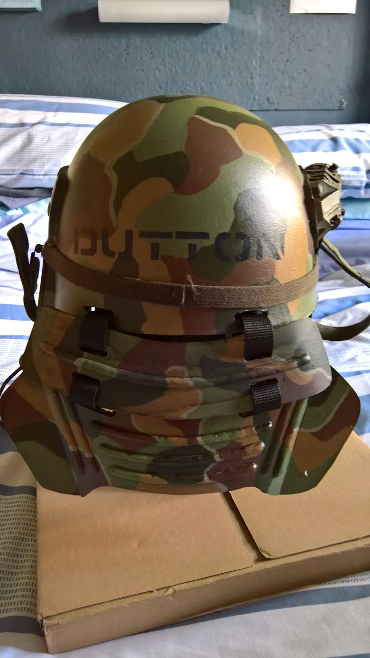 This is the helmet I have. It's just a hobby project I put together a couple of years back and repainted as part of the upgrade. It will need replacing for an accurate earpiece. Note that since these photos were taken I have painted over my name on the back and reapplied it much smaller.