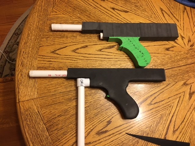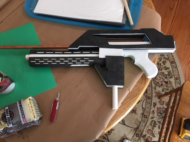 If you were going to make the 2 part system like I did for the pulse rifle, I’d recommend finding a good side view and blowing it up on the printer (I always use PowerPoint but I am old fashioned). For the Thompson portions, I’d blow up a picture of s Thompson without the stock or foregrip. The shroud is a little tricky because it’s at a goofy bevel at the sides and bottom but if you make it from thin, but fairly rigid (maybe 4mm) foam and fill it in with solid pieces, it works great. Can’t see it but he 1/2” PVC running through the center where the mag would go over has a “T” piece I modified to “snap” the grenade launcher barrel to. When it is in, it hold the entire unit together but during building, allows you to remove the launcher to paint and modify it separately. I used PVC because I wanted something for the rifle barrel shroud, “sliding” (it does NOT slide) stock, and barrel holder (that Upsidedown V-shaped piece near the end of the barrel) to mount to. These were important because of the need to the sling to mount to something solid. Be happy to share any plans I can if they would do anyone any good.