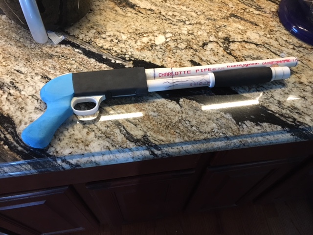 His Ithaca Model 37 (Close Encounters version) is foam as well. The PVC chamber and barrel were stretched to make the barrel narrower and thinner. The light is made from sheet plastic from Menards with the raised areas and light diffuser made from a heavy ‘For Sale’ sign. The light itself was borrowed from a $2 flashlight. The adjustable ‘neck’ was all kinds of complicated to build!!!