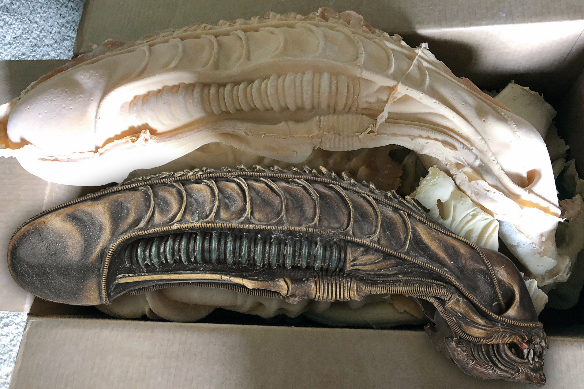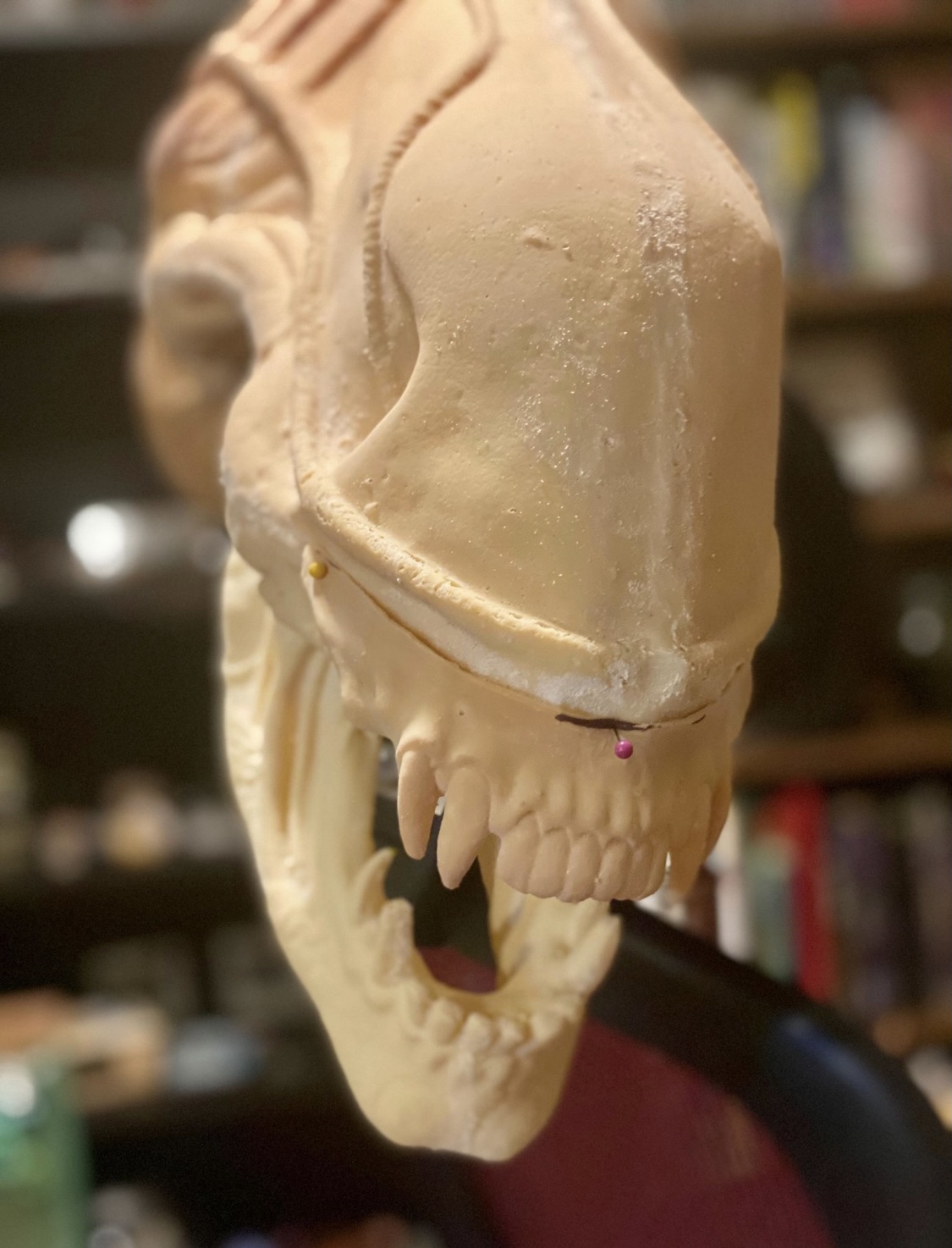 In the meantime, here’s the head with some roughly pinned on teeth! It still needs a wash and then some filler/repair with liquid latex