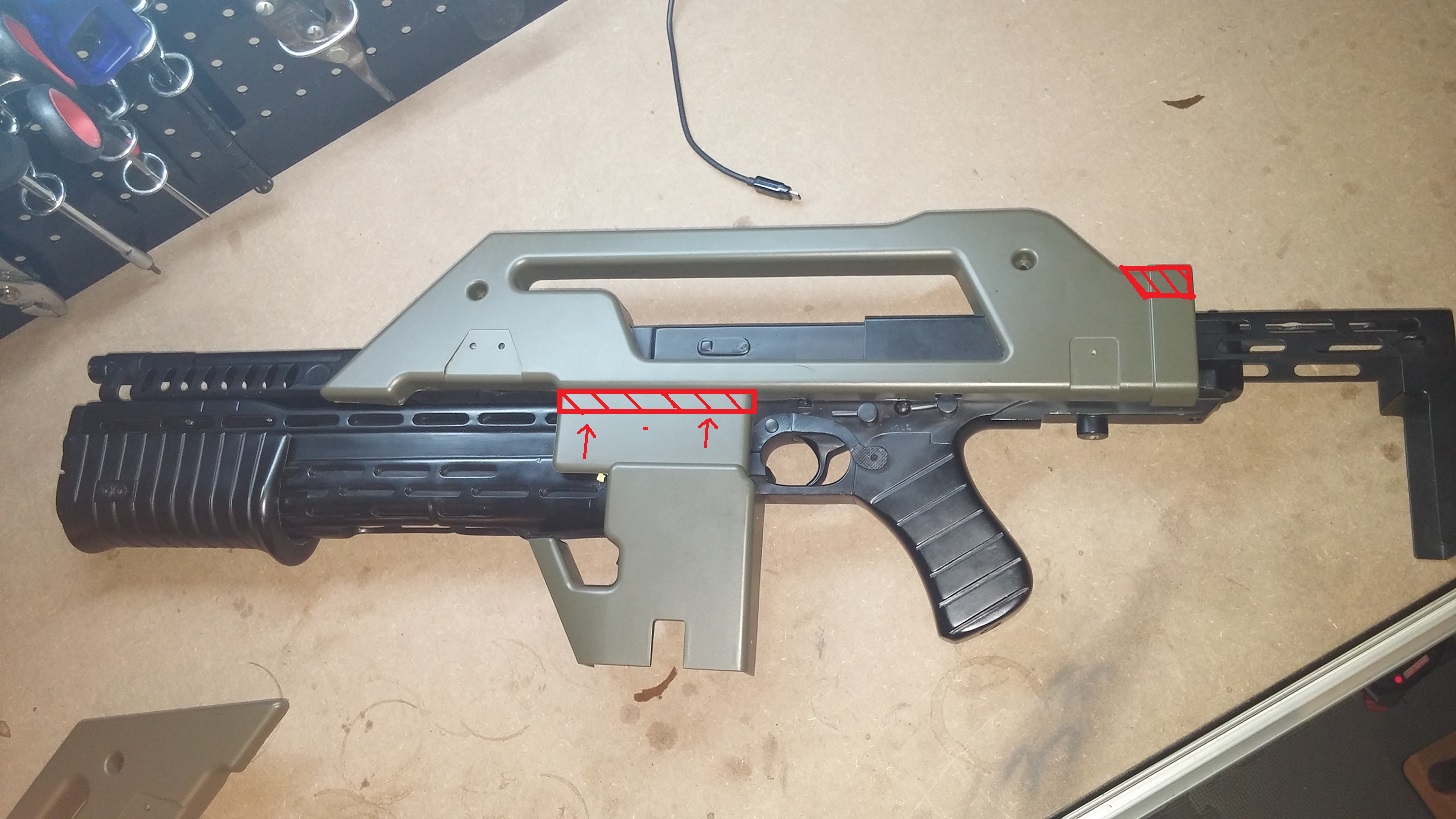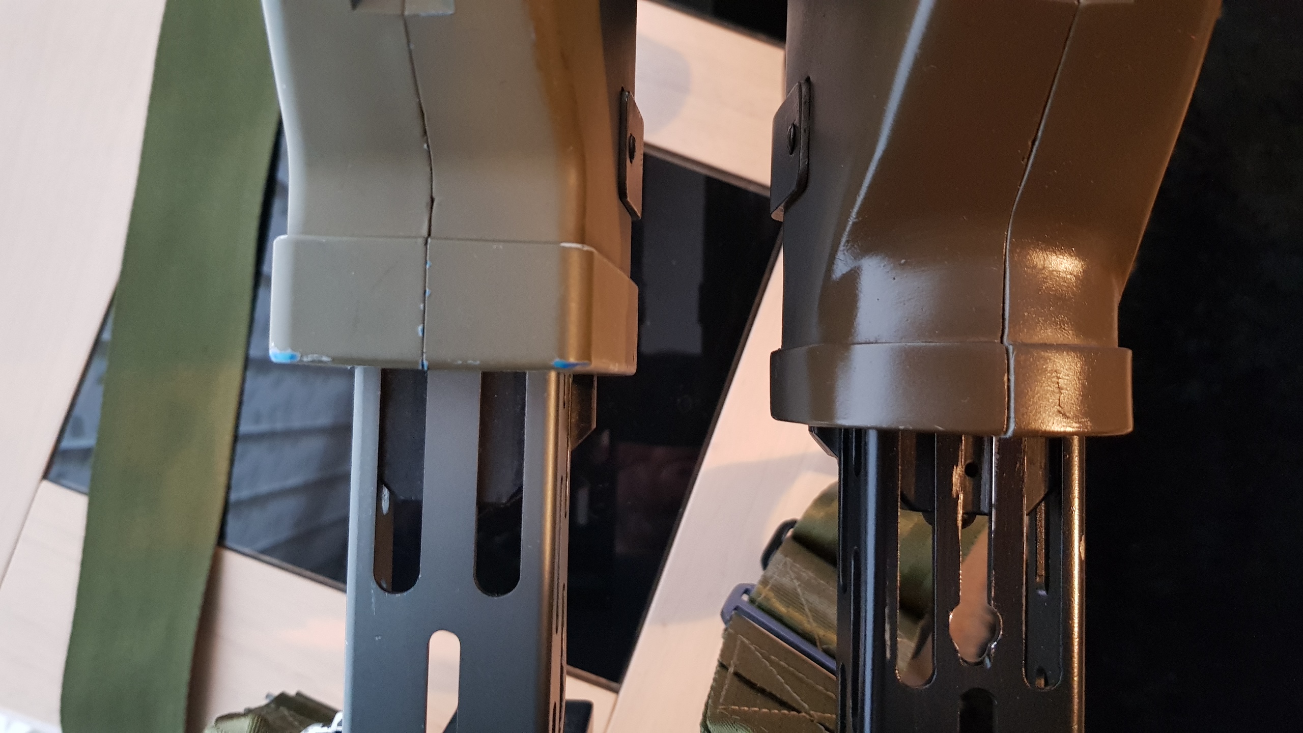 I swapped stocks for a sd studios stock and done the stock release button underneath mod. While the pr was stripped i went about rounding off the rear of the shroud which i used pvc pipe. Filled and smoothed it off nice with filler. When i went to test fit the shroud the stock button mod is on the outside of the shroud further towards the back of the pr.