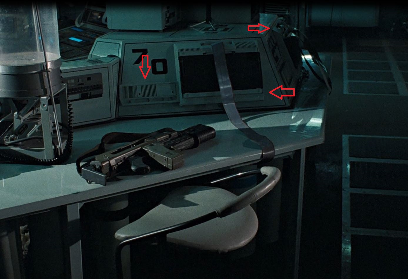 bughunt10 was used in the Sulaco Hypersleep bay and Atmosphere Processor, and the grey/black “Apricot Xi” with one 3.5 inch floppy disk drive can be seen on the desk in Medlab (along with the black keyboards attached). These two models share the same casing style aside from colour and the two drives versus one drive. The bottom tray portion of the housing and the rear panel are used extensively throughout every scene in the film.