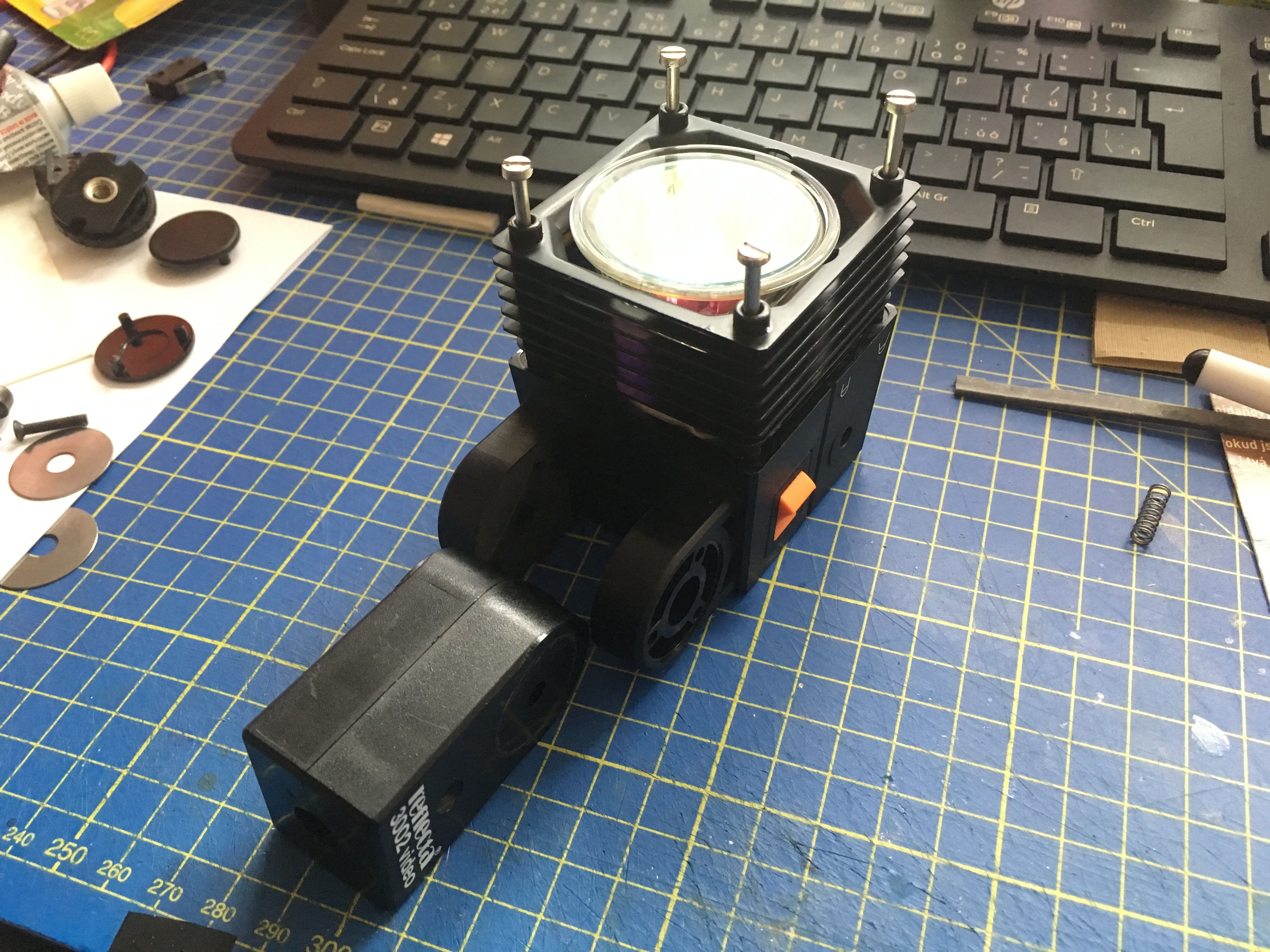 Thanks, guys! I printed the right side hanger, time to move on to the main parts of the gun. Some more parts arrived in the mail, including an almost mint Reflecta 3002 lamp. It's so nice that I felt a little bad for having to take it apart and re-purpose it. I tried a quick mock-up with a halogen bulb since I had to order a correct looking LED from overseas. 12 halogen might work as a temporary solution, but it would chew through any battery with over 2 amps of current draw.