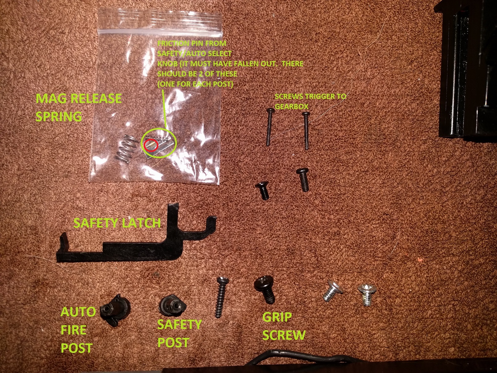 GREEN screws go into the main body of the trigger housing (differs from previous advice above)