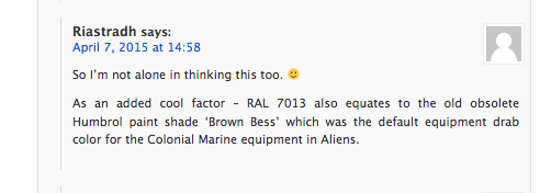 As most regulars here know, the '170 Brown Bess' by Humbrol was a vital part of the colonial marine color scheme. It was used for everything from the Pulse Rifle shrouds, to motion trackers, to hand welders, to belt tools. Its unique properties often look 'olive drab' in a low light, cool color setting. (which filmed with a blue filter, virtually all of "Aliens" appears this way). But it was the beloved "Brown Bess". Original Humbrol brown bess has LONG been discontinued. It was replaced by "Super enamel" Humbrol brown bess (of the same color code 170, but lighter and different in appearence). The reformulation was NOT the same. This is nearly a moot point because even the reformulated "Super Enamel" version was