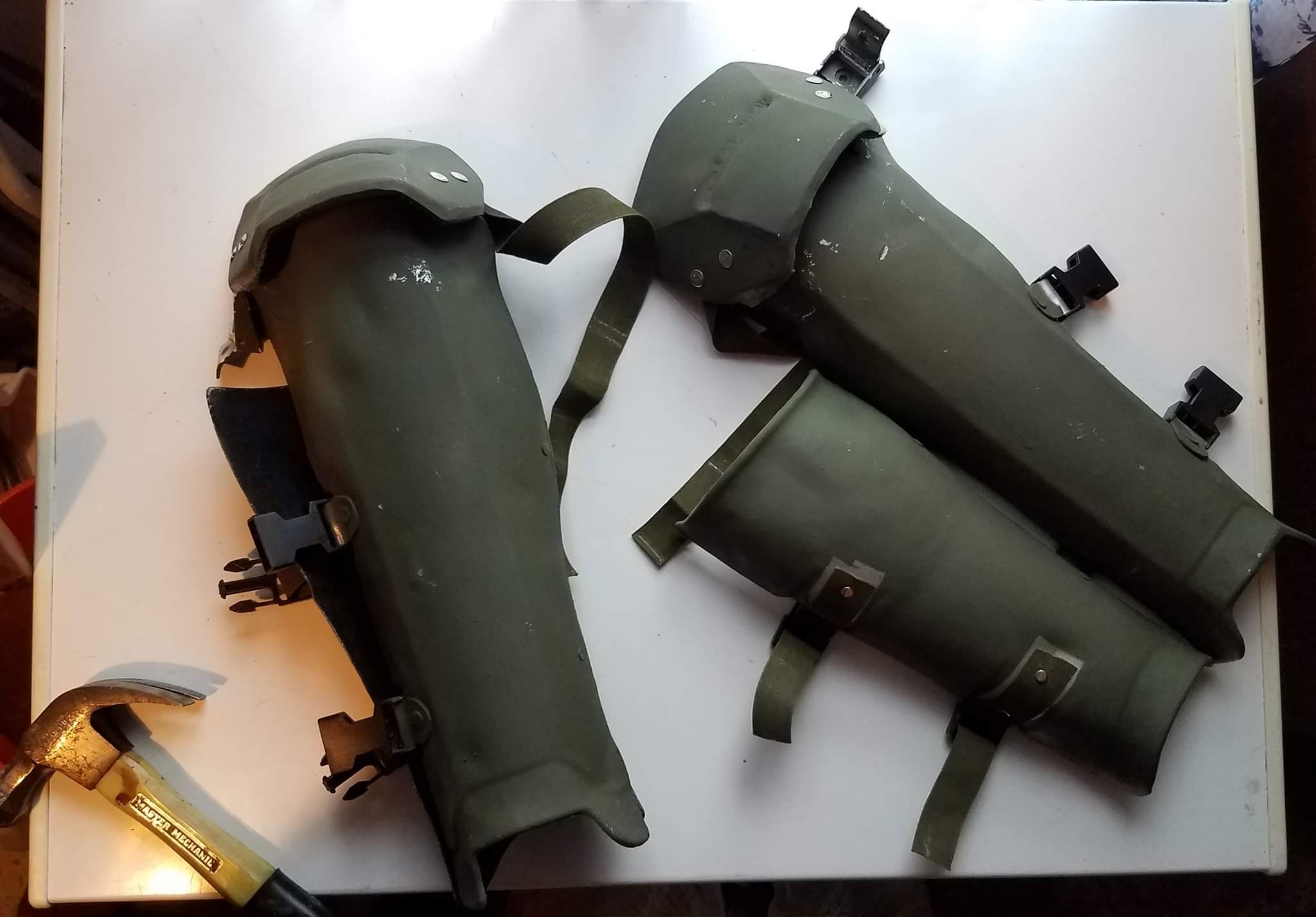 Here's where my greaves are at. The lower portion is a set of aluminum powder infused fiberglass casts from Stephen210, and the knee portion is hammered aluminum from BigbisonT. I finished riveting them back together this morning, and now I can begin the camo painting for the whole set. While I'm at it I will repaint my old set of plastic greaves, then I will have everything uniform and screen accurate across both sets or armour.
