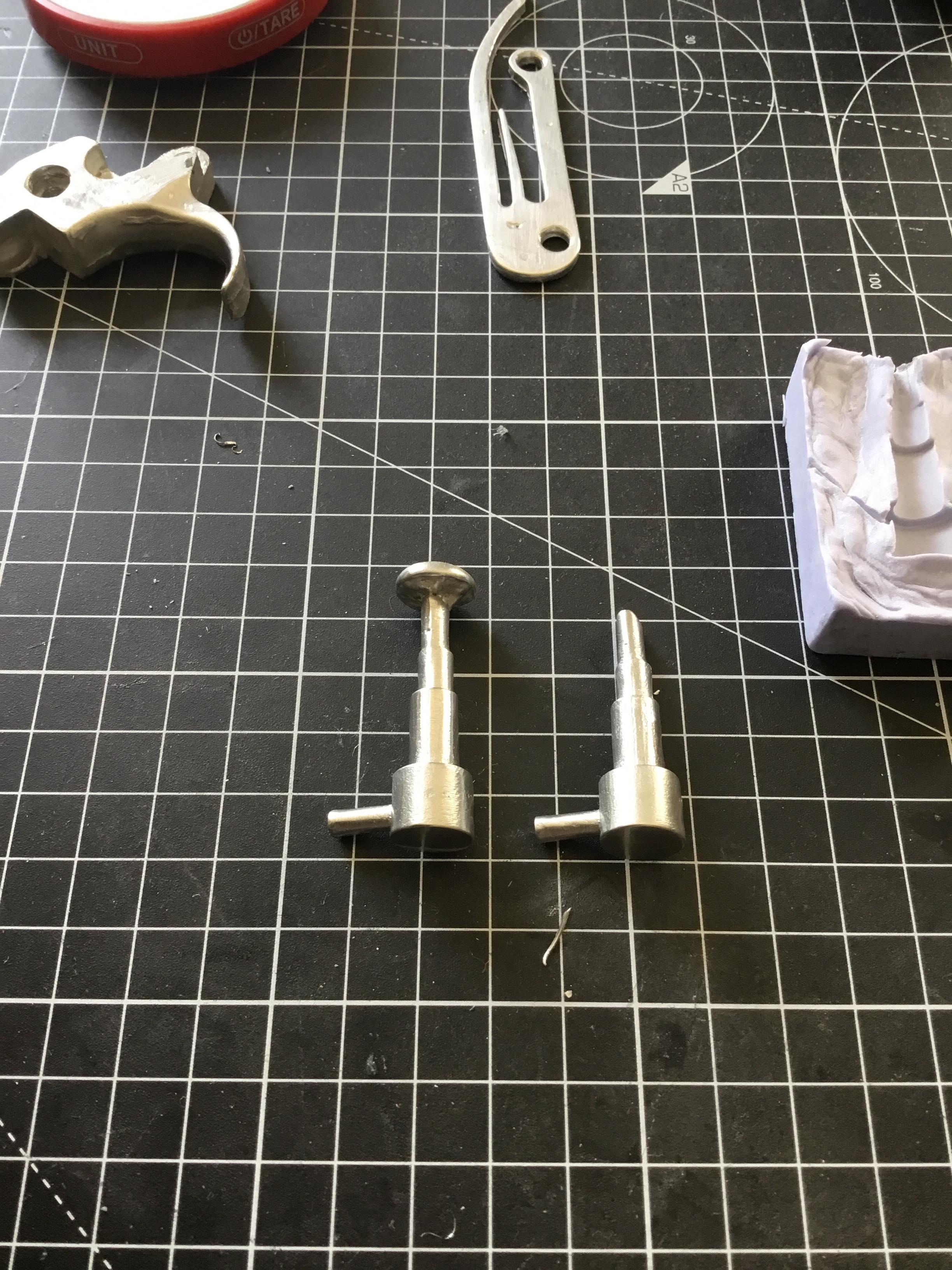 Hand milled aluminum (using a wood router table) and cast pewter Thompson bolt WIP