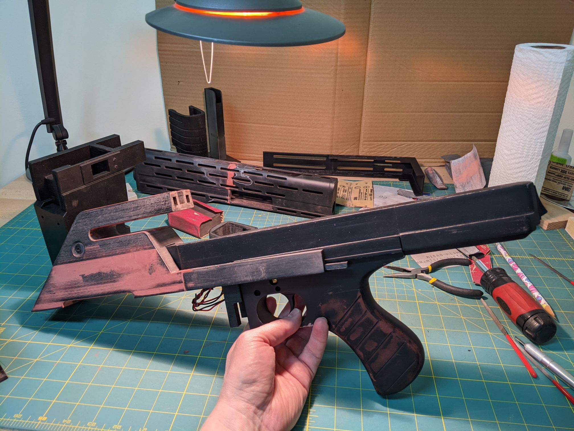 The upper shroud had three sets of wires coming out of it - the trigger, the on/off switch, and the muzzle LED. In the lower shroud I'd be adding the speaker and the battery power, and then it'd all be wired up to the Majenko counter & LED control board. As I'd been assembling sections and pulling wires through channels, I'd been using a multimeter to make sure my wiring was good.