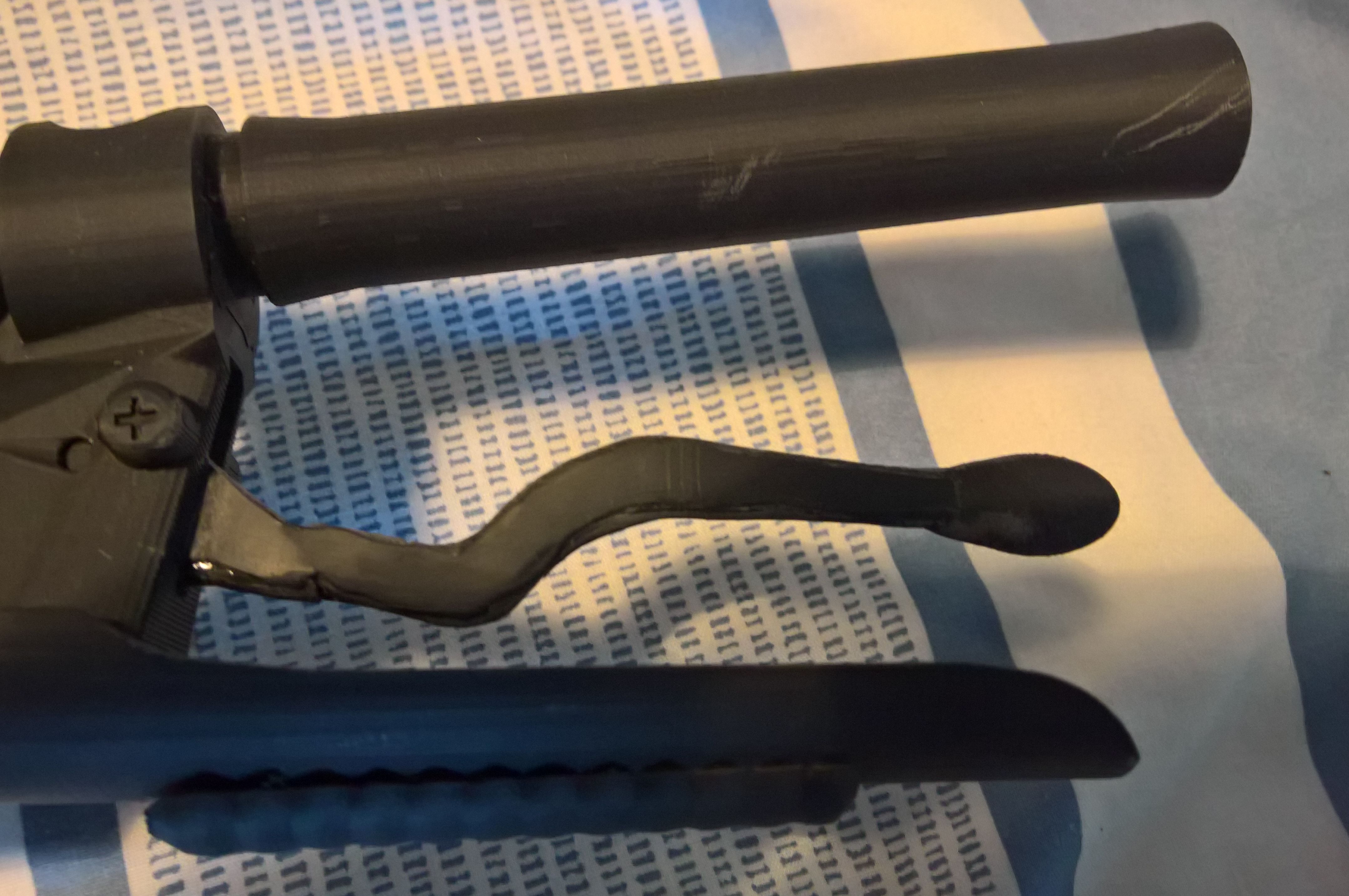 More significant though is the rear grip trigger handle. I can't understate just how fragile this is, a slight knock and it snaps. After twice attempting to fix it with just glue and pinning wire I decided to glue 0.5mm thick plasticard to either side of the handle as well, starting with a paper template for the shape.