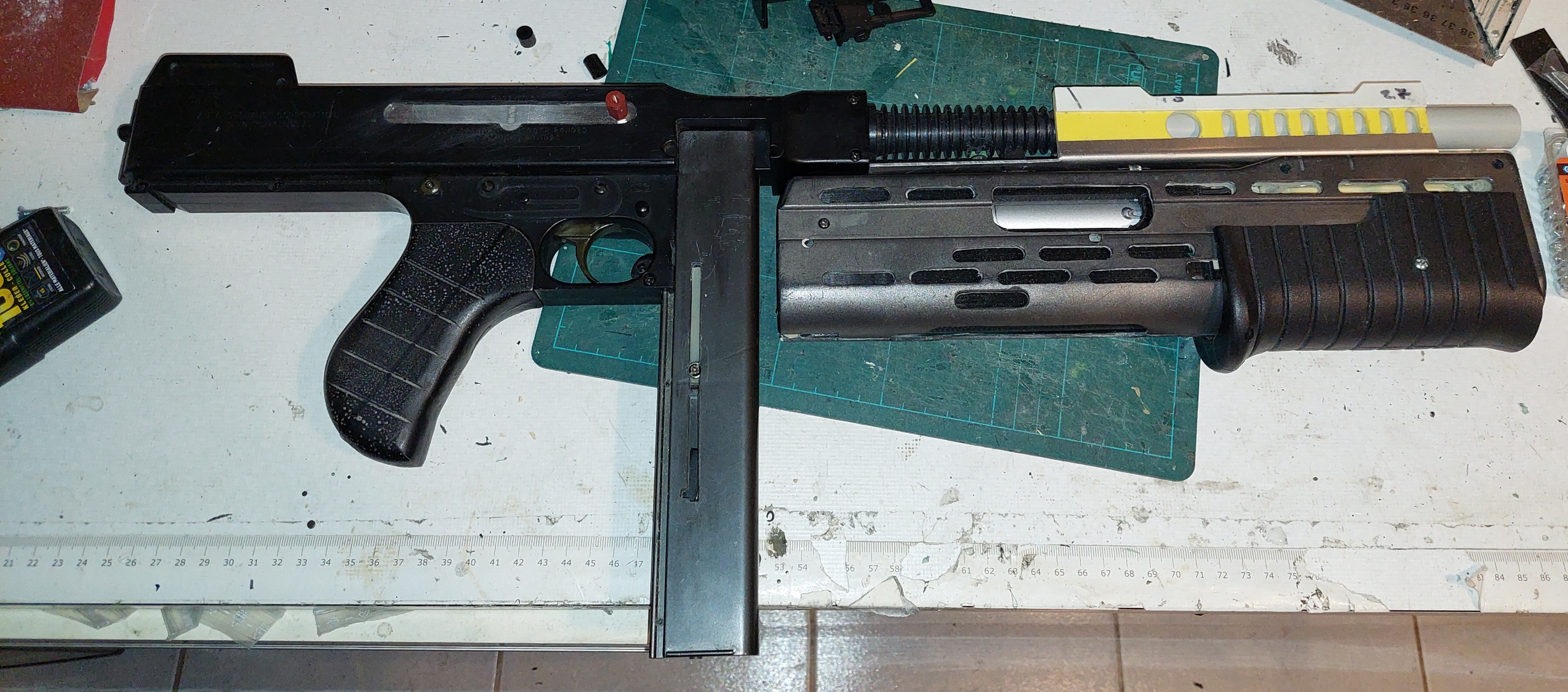 Once the grenade launcher was finished, the most difficult thing was to join both components. Luckily, the Thompson has a front mounting bracket, and I bolted an aluminum plate to it, with which I secured the Spas. Later I will use this plate as a support for the cooling fins