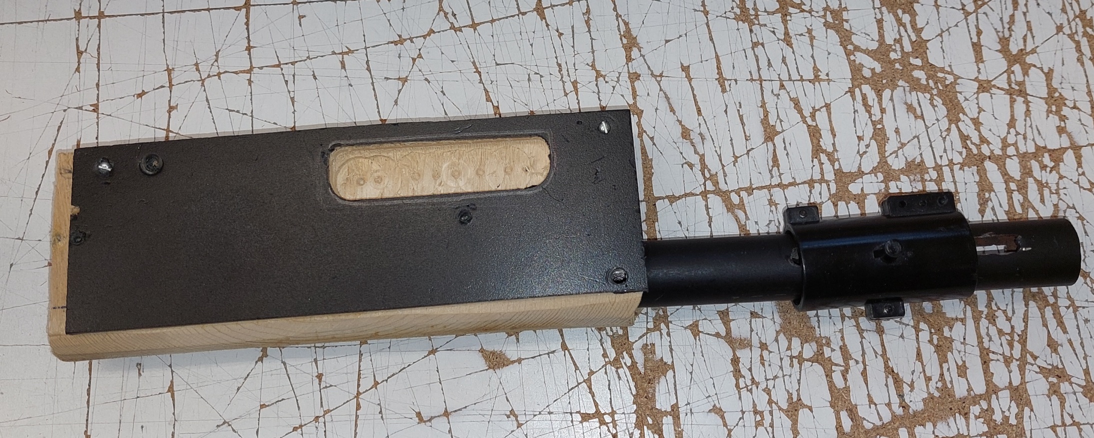 Once the grenade launcher was finished, the most difficult thing was to join both components. Luckily, the Thompson has a front mounting bracket, and I bolted an aluminum plate to it, with which I secured the Spas. Later I will use this plate as a support for the cooling fins