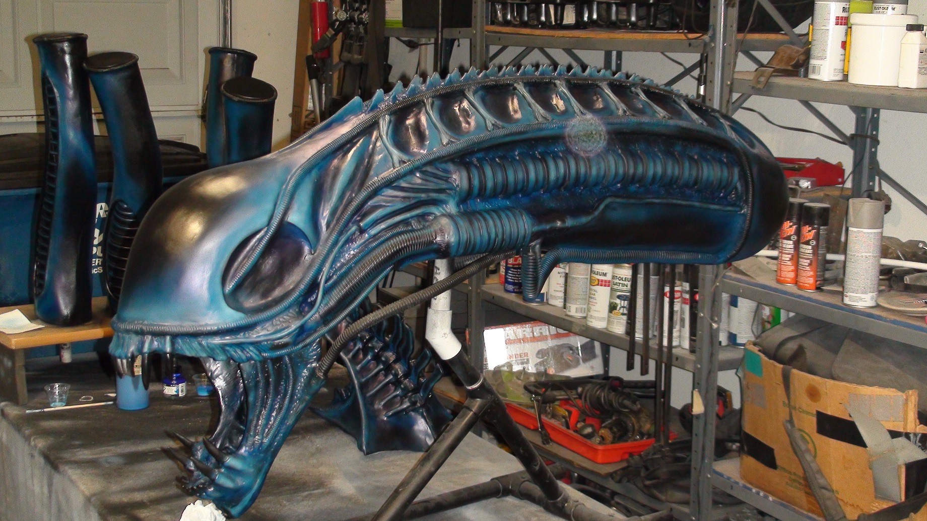 The back and spine are done.. the spine just lays on the back it's not attached. This is the side of the Alien you won't be able to see when it is hanging in place anyhow.