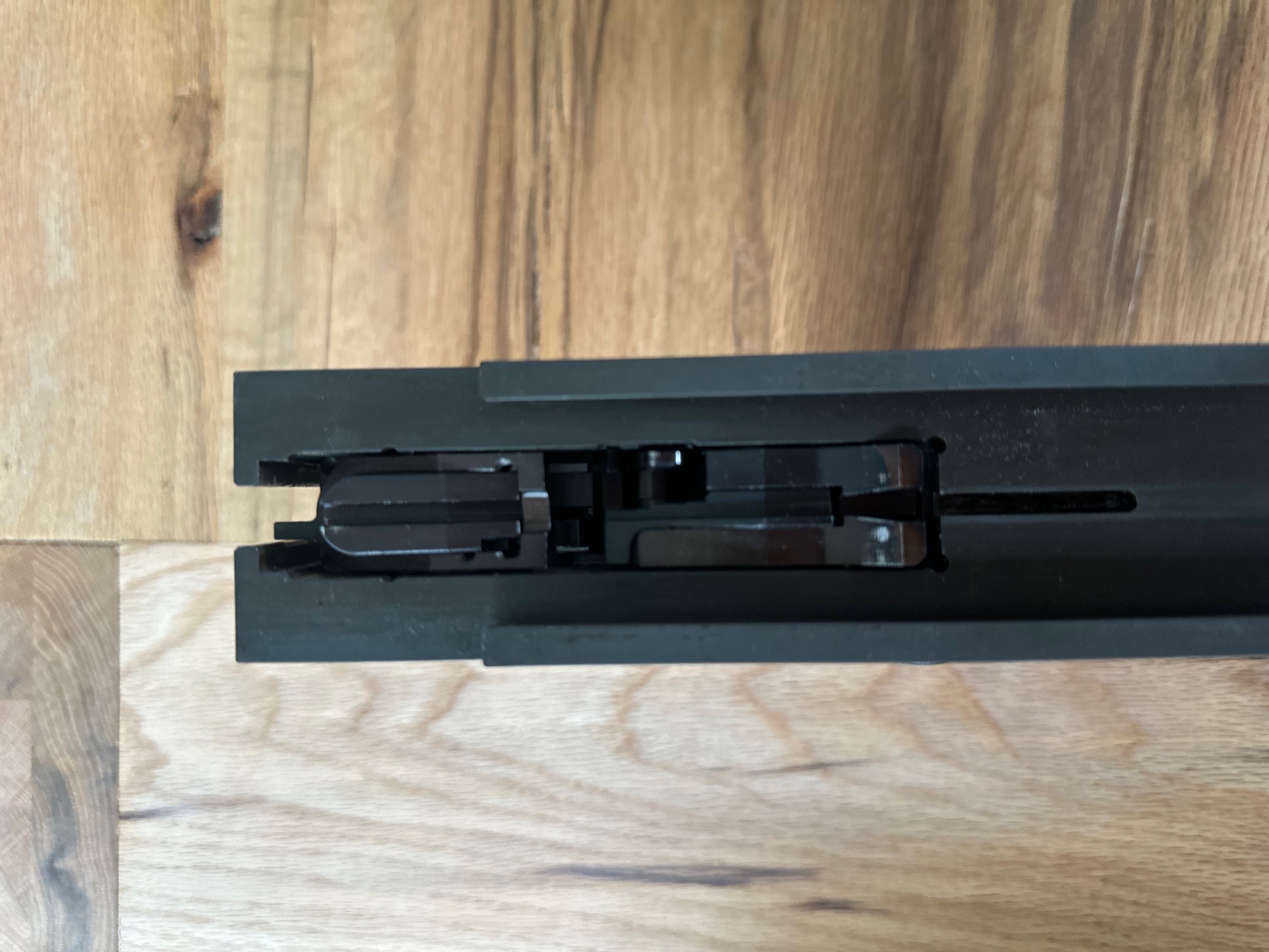 BoltNow this one really has me stumped. I guess it might be possible to use a lever type micro switch again if I could somwehow position it in the lower receiver. I do have a couple of really small lever switches that could fit. Still, there's the problem on how to mount the switches in the small space of ever moving parts. Or maybe a button type switch at the rear of the receiver that registers when the bolt is pulled back? That would make it necessary to get the cables all the way back though. A push button at the front doesn't seem feasible.