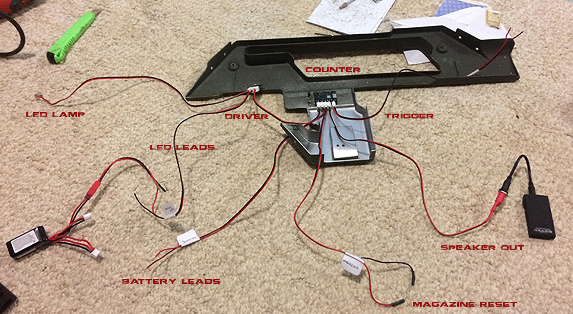 There are a few images here showing the wiring of the old SD Studios Pulse Rifle, but the images are too small to make out much detail, especially on how they mounted the switch. It shows that they cut a channel into the front of the lower receiver to lead the cables out of the lower to the counter, which seems interesting. I didn't think about that at first, but that seems to be the only way to lead the cables out, any other way and the cables would either get in the way of the magazine or the bolt.