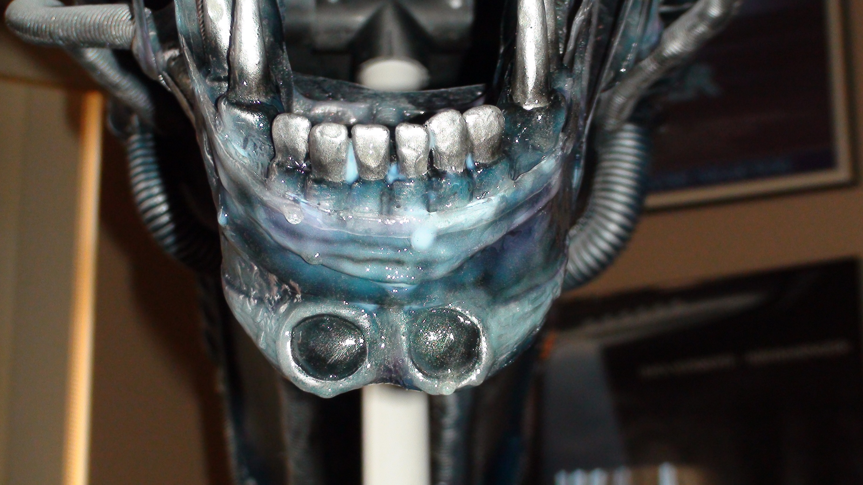 I'm calling the paint job on the head done... did some dry brushing silver and some finally touches.. Now I have to permanently attach the jaw and blend that in.. and gloss coat it. Lips will be a separate project.